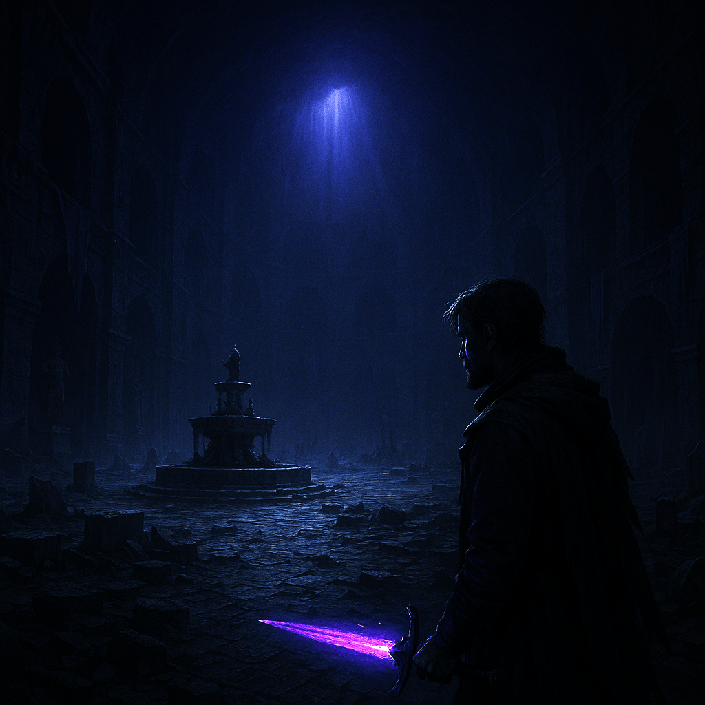 Then it fades, swallowed by silence. The world returns to rubble and broken steel. Another pulse bursts outward, but no phantoms return. My heartbeat steadies, and Gloomsheer’s resonance softens; its pulses growing weaker, the blade recognising the lull. I loosen my grip, returning it to my side, but as I do, my violet sight vanishes, buried beneath the smothering dark and dust-laden air.
